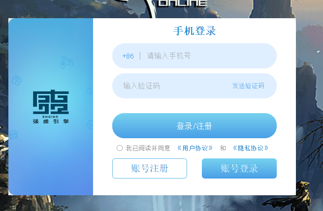 第一步:启动游戏后新注册一个强盛引擎的登录账号。输入手机号码,注册成功后该手机号码为账号,密码会通过短信方式发送到手机号码上。